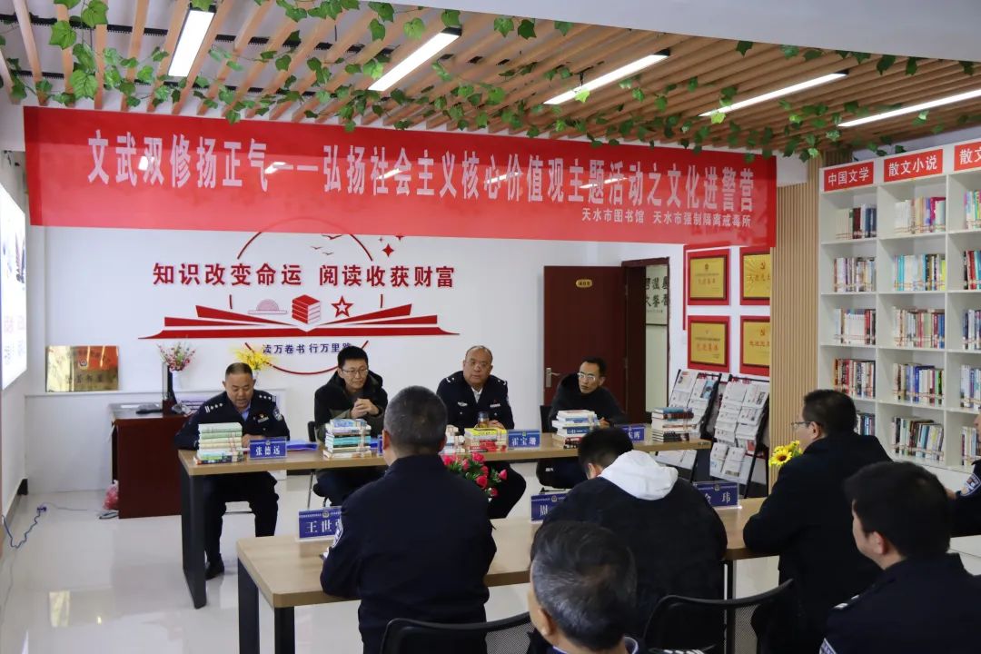 為大力營(ying)造全體民(min)輔(fu)警愛讀書、讀好書、善讀書的濃厚氛(fen)圍,4月(yue)24日,在(zai)全民(min)讀書月(yue)之際,天水市公安局聯合(he)市圖書館(guan)在(zai)天水強制(zhi)隔離戒毒(du)所開展“全民(min)讀書月(yue)·文(wen)化進警營(ying)”活動。