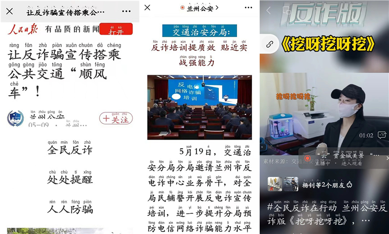 反電(dian)(dian)詐(zha)宣(xuan)(xuan)傳(chuan)專班利用多媒(mei)體(ti)平臺錄制反電(dian)(dian)詐(zha)版(ban)“挖呀(ya)挖”,在各媒(mei)介平臺進行(xing)了展播,廣大民輔警實時瀏覽并積極(ji)轉發。同(tong)時,在中央及省市(shi)媒(mei)體(ti)廣泛(fan)刊發“五一”小長(chang)假(jia)反詐(zha)宣(xuan)(xuan)傳(chuan)不(bu)放假(jia)、讓反詐(zha)騙(pian)宣(xuan)(xuan)傳(chuan)搭乘公(gong)共交通“順風車”、全警參(can)與、協同(tong)互動,讓蘭州市(shi)公(gong)安(an)局交通治安(an)分局防范電(dian)(dian)信(xin)網絡詐(zha)騙(pian)宣(xuan)(xuan)傳(chuan)工作再(zai)發力。