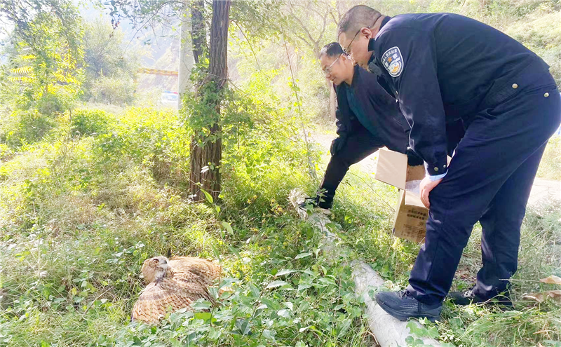 到達(da)現場(chang)后(hou),經確認該野(ye)生(sheng)物種屬于國(guo)家二級(ji)保(bao)護動物、雕鸮(貓頭(tou)鷹)。通過(guo)現場(chang)檢(jian)查,該貓頭(tou)鷹身體狀況良好(hao),無外傷,活動情況良好(hao),具有野(ye)外生(sheng)存能(neng)力,符合(he)放生(sheng)條(tiao)件。于當(dang)日,民警將其帶至野(ye)外放歸大(da)自(zi)然。