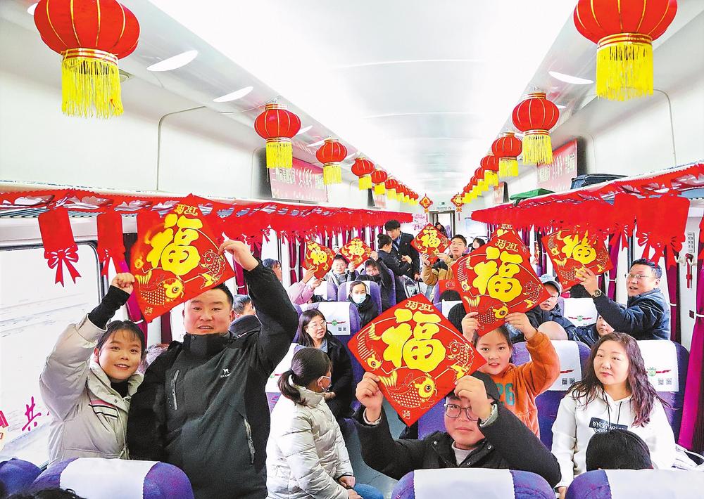 7504次“富(fu)民號(hao)”列車上張燈(deng)結彩,歡聲(sheng)笑語。新(xin)春佳節來(lai)臨之(zhi)際,無數人心懷(huai)著對家鄉的眷(juan)戀,踏上溫馨的回家之(zhi)路(lu)。 新(xin)甘(gan)肅·甘(gan)肅日報記(ji)者丁凱攝