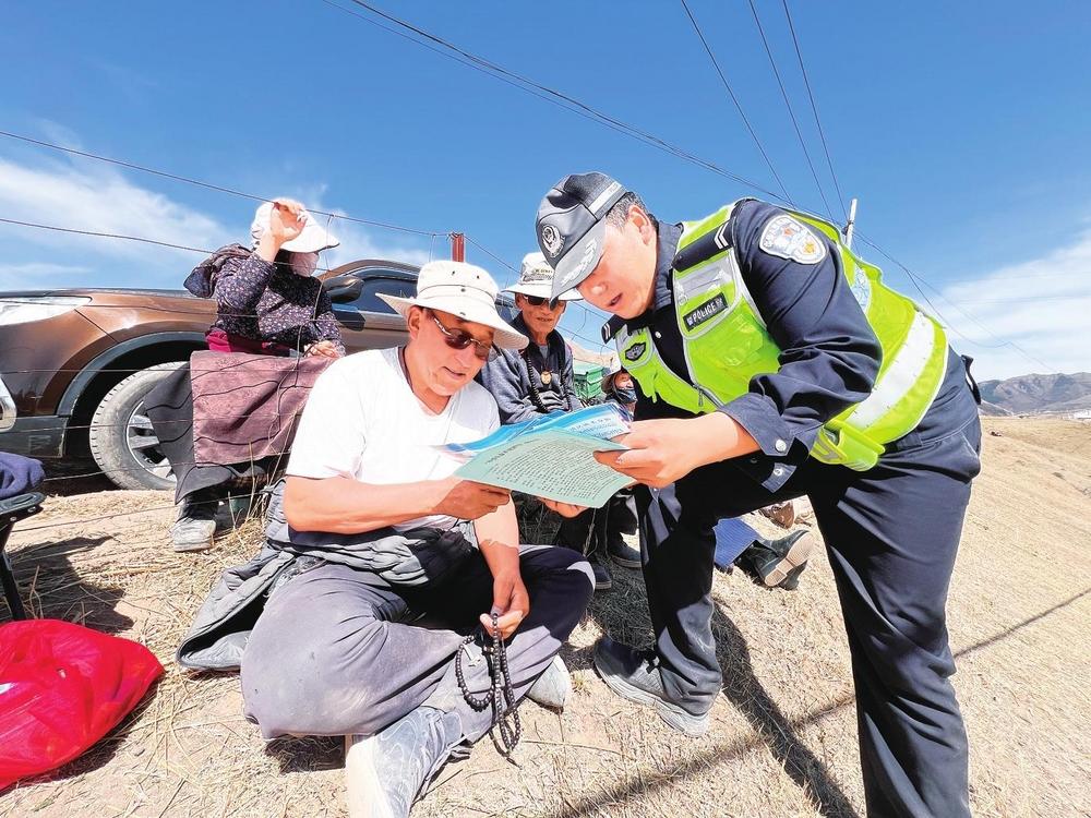 民輔警向群眾講解交通安(an)全(quan)知識。近日,碌(liu)曲縣公安(an)局交警大隊民輔警借助夏(xia)澤(ze)灘(tan)春(chun)季賽馬活動有利時(shi)機,開展“美麗鄉村行(xing)”交通安(an)全(quan)巡回(hui)宣(xuan)傳(chuan)活動。 新甘(gan)肅·甘(gan)肅法治報(bao)記者金凡(fan)裕攝