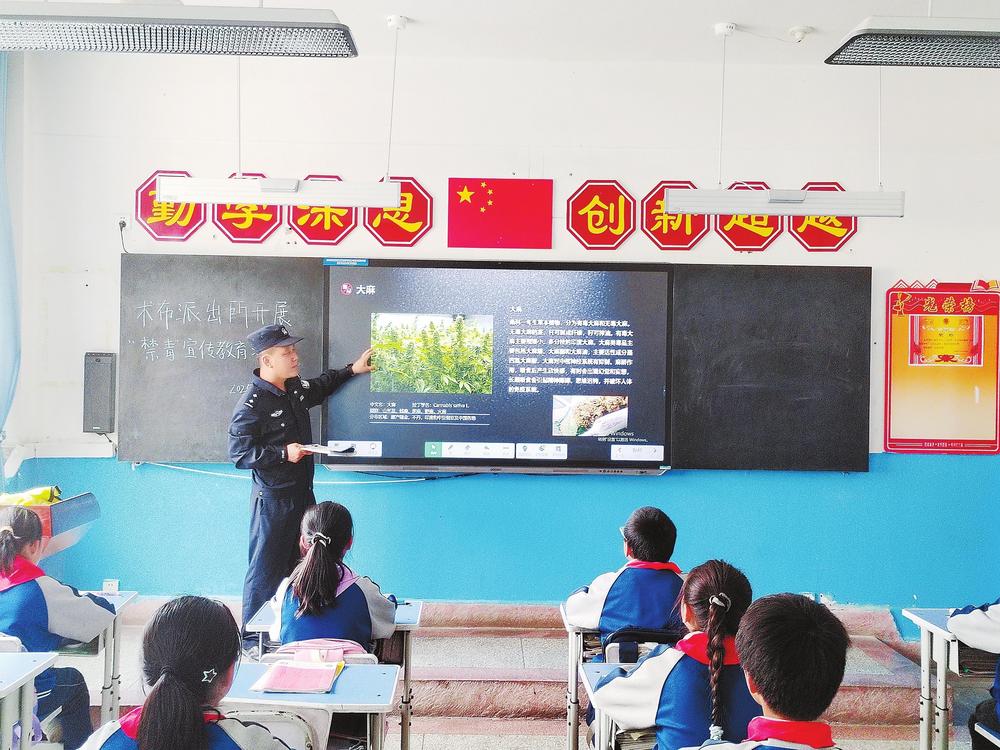 民警正給學(xue)生講解“防范青少(shao)(shao)年(nian)藥物(wu)濫(lan)用(yong)”等(deng)禁毒(du)知識。近(jin)日,臨潭縣公(gong)安局術布派(pai)出所(suo)民輔警走進轄區學(xue)校(xiao),開展以“防范青少(shao)(shao)年(nian)藥物(wu)濫(lan)用(yong)”為主(zhu)題的(de)禁毒(du)宣傳活動。 新甘肅·甘肅法治報記(ji)者(zhe)金(jin)凡(fan)裕攝