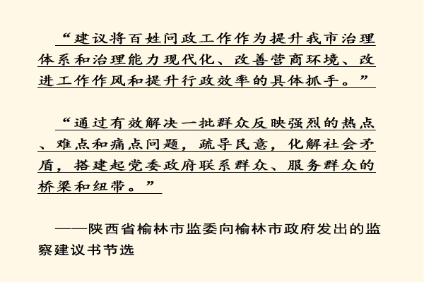 2019年12月6日,榆林(lin)(lin)市監委制發的(de)《關于(yu)解決(jue)百姓問政工作中(zhong)存(cun)在問題的(de)建議》的(de)監察(cha)建議書送達榆林(lin)(lin)市政府(fu),并交于(yu)市長(chang)本人(ren)。