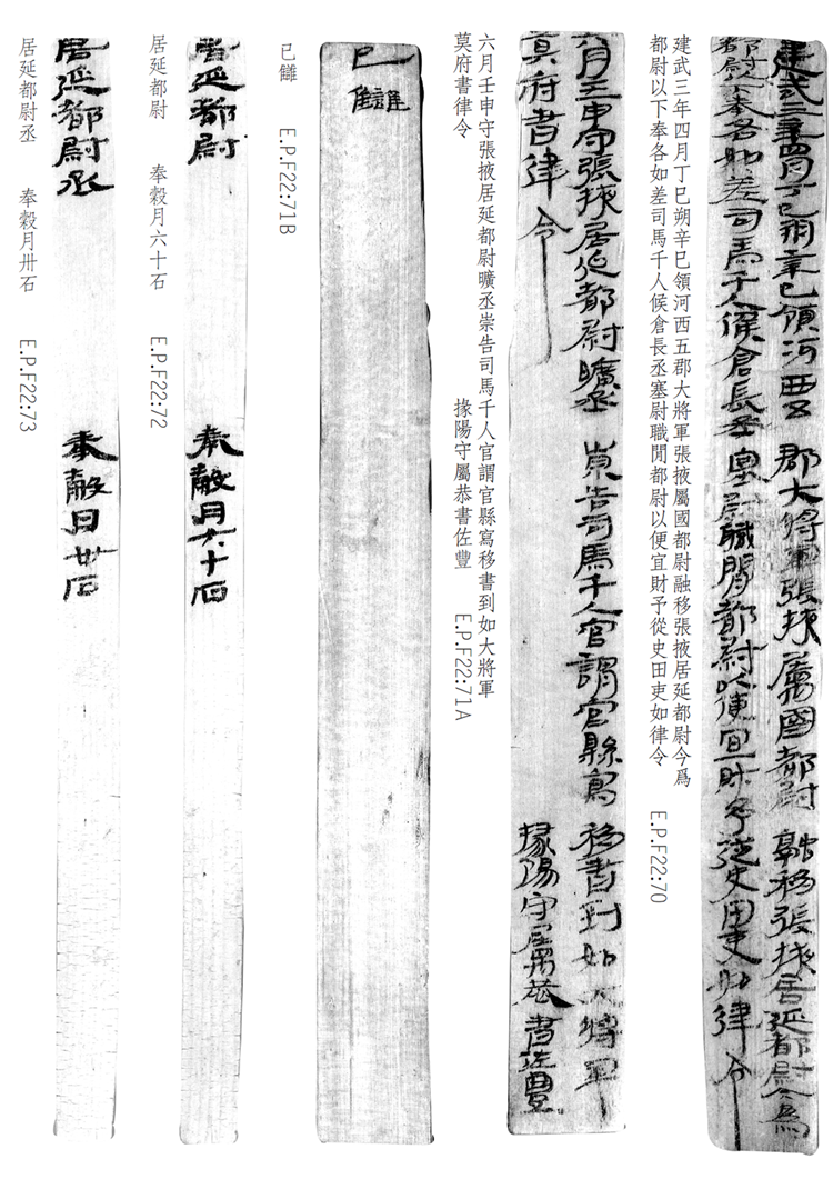 1974年(nian)8月出(chu)土(tu)于甲(jia)渠候(hou)官遺址第22號房址內(nei)。簡(jian)冊由10枚簡(jian)組成,每簡(jian)長22.8厘(li)米(mi),前兩簡(jian)寬2.5厘(li)米(mi),其(qi)(qi)余8簡(jian)寬1.4厘(li)米(mi)。全文200字。內(nei)容為東(dong)漢(han)建武三年(nian)(公元25年(nian))竇融統治河(he)西(xi)期間留(liu)下的一份完整的財(cai)政(zheng)文書。簡(jian)文是(shi)關于居延都尉府吏(li)員(yuan)奉谷標準的通(tong)知,由領河(he)西(xi)五郡大將軍張掖屬國都尉竇融幕府下發,簡(jian)言“如律(lv)令”可(ke)知其(qi)(qi)指令具(ju)有法律(lv)效力(li)。