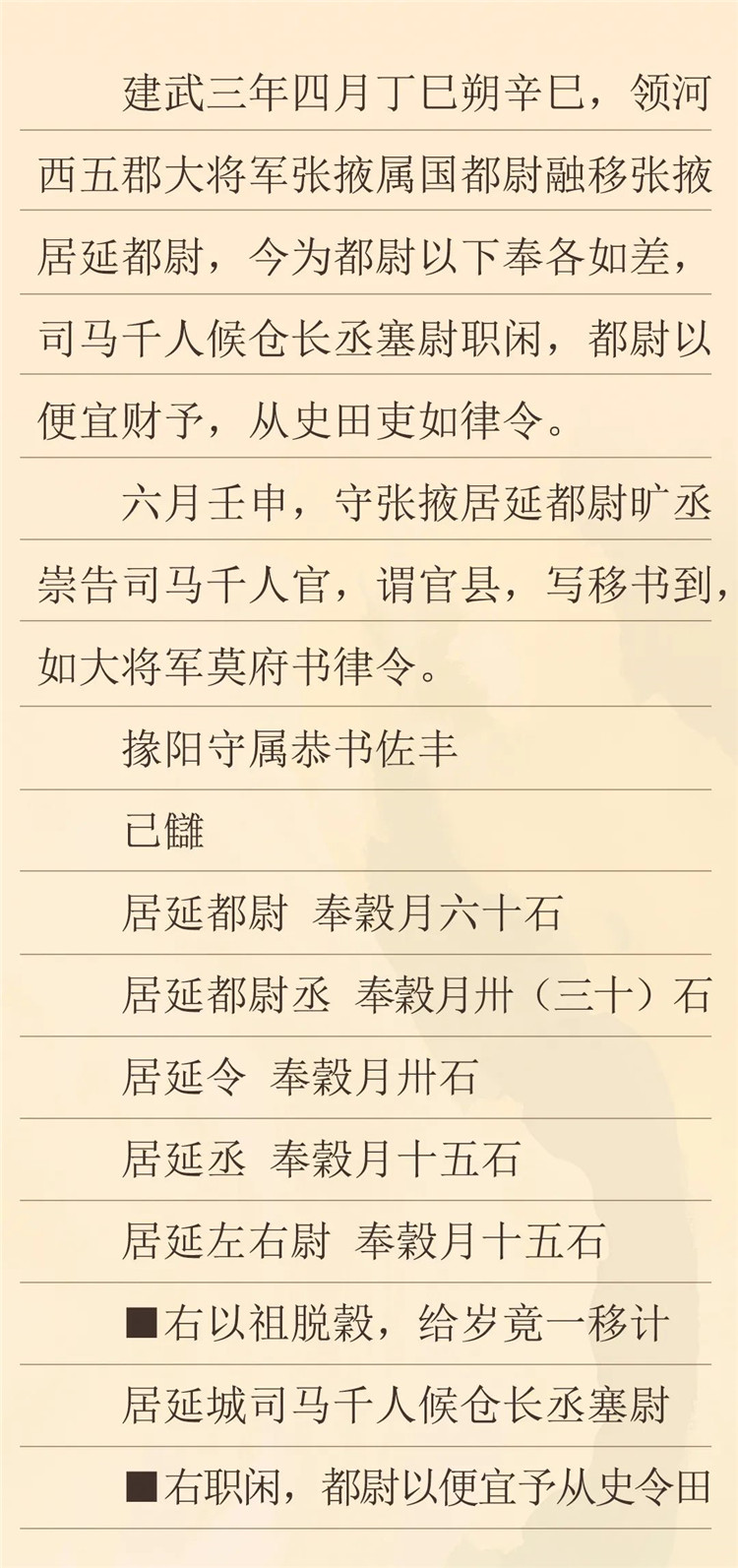 這封冊(ce)書記載了建(jian)武三(san)年(nian),竇(dou)融管(guan)轄河西時發布(bu)的(de)一(yi)條關于都尉以下官(guan)吏(li)奉谷等差的(de)命令。根(gen)據竇(dou)融發布(bu)的(de)新規定,我們(men)可(ke)以看到,秩比二千石的(de)居延都尉月(yue)奉谷僅為六十石,史書有“十斗(dou)一(yi)斛(hu)(hu)”及“十斗(dou)一(yi)石”的(de)記載,此六十石即是六十斛(hu)(hu),相比于史書記載中(zhong)比二千石每月(yue)百(bai)斛(hu)(hu)的(de)俸例要(yao)少,而其余官(guan)吏(li)的(de)俸祿也相應要(yao)少,雖然漢(han)代不同時期的(de)官(guan)吏(li)俸祿存在變化,但對比所見的(de)這種情況(kuang),可(ke)能也跟(gen)兩漢(han)之(zhi)交戰亂(luan)頻仍的(de)社會環(huan)境有重要(yao)關系(xi)。(李(li)晶(jing)整理)