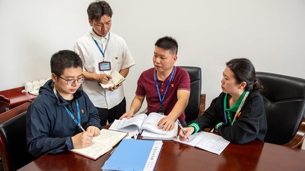 圖為唐玉軍(右(you)二(er))正(zheng)在與同(tong)事(shi)們(men)一起(qi)研判問題線(xian)索(suo)。張(zhang)津 攝