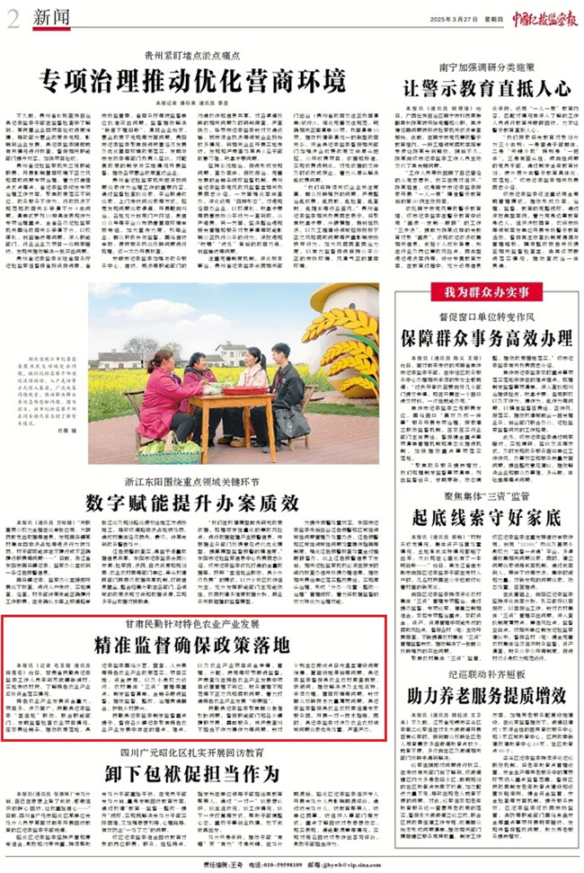 特(te)(te)色農業(ye)產(chan)業(ye)發展資金(jin)量大、項(xiang)(xiang)目多、涉(she)及(ji)面廣,民(min)勤縣紀(ji)委(wei)監(jian)委(wei)“室組地(di)”聯(lian)動(dong),聯(lian)合職(zhi)能部門,定期監(jian)督檢查農業(ye)項(xiang)(xiang)目情況,壓緊責任鏈條(tiao)(tiao),推(tui)動(dong)政策落地(di)。縣紀(ji)委(wei)監(jian)委(wei)圍繞(rao)沙蔥、茴香、人參(can)果等特(te)(te)色農業(ye)產(chan)業(ye)政策落實、項(xiang)(xiang)目實施、資金(jin)使(shi)用,以及(ji)小微權力運行(xing)、農村(cun)集(ji)體(ti)“三(san)資”管理(li)等重點,制定監(jian)督清單,全鏈條(tiao)(tiao)跟(gen)進監(jian)督,推(tui)動(dong)監(jian)督、整改(gai)、治理(li)貫通(tong)融合,護航(hang)鄉(xiang)村(cun)振(zhen)興。