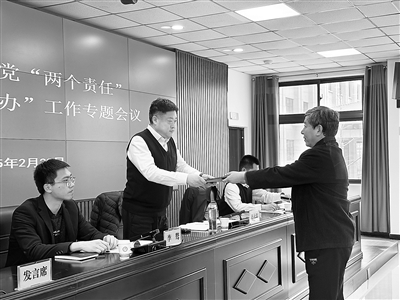 圖為河南省安陽市(shi)(shi)紀委(wei)監(jian)委(wei)向派駐市(shi)(shi)水(shui)利局(ju)紀檢監(jian)察(cha)組遞交2025年度(du)全面從嚴治黨監(jian)督責任(ren)清單,持(chi)續(xu)推(tui)動“兩個責任(ren)”走深走實。王小山(shan) 攝
