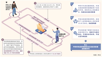 違法(fa)發(fa)放貸(dai)款(kuan)罪(zui)。2013年10月至(zhi)2016年1月,甲(jia)利用其擔任A市B區支行(xing)(xing)黨委委員、副行(xing)(xing)長的(de)(de)職務便利,接受多家公司(si)和個(ge)人(ren)請托,在明(ming)知其借款(kuan)用途(tu)不真實、貸(dai)款(kuan)資料虛假或冒名貸(dai)款(kuan)等情形下,要求下屬不嚴格調(diao)查(cha)、形成不實的(de)(de)調(diao)查(cha)報(bao)告,并作為分管副行(xing)(xing)長對相關公司(si)和個(ge)人(ren)申(shen)請的(de)(de)貸(dai)款(kuan)審核(he)通(tong)過,違法(fa)發(fa)放貸(dai)款(kuan)3670萬元(yuan),造成本金456.25萬余元(yuan)未收回。