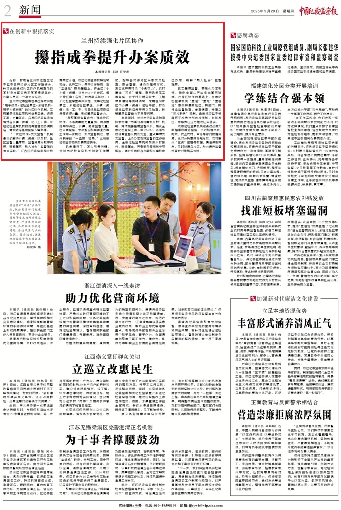 “凝聚(ju)基(ji)層監督合力,強化片區協作,不是簡(jian)單的力量(liang)疊加,而是要統籌好縣區、鄉鎮、街道監督力量(liang),在(zai)日常監督、專項整(zheng)治和案(an)(an)件查(cha)辦等工作中一體聯(lian)動,形成(cheng)監督聯(lian)動、案(an)(an)件聯(lian)審的‘一盤棋(qi)’格局。”蘭州市(shi)紀委監委相關負責同(tong)志表示。