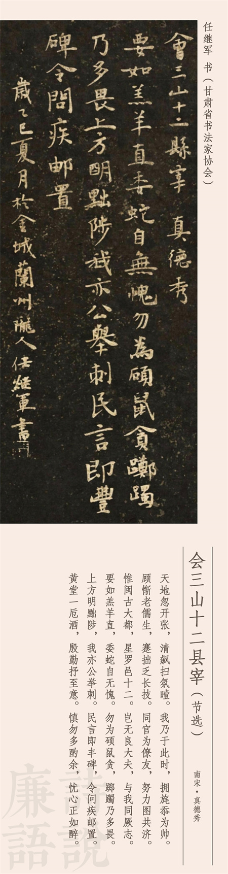 公元1232年,南宋(song)官員真(zhen)德(de)秀到(dao)福州擔任(ren)知(zhi)府,到(dao)任(ren)后(hou)把下轄12個縣(xian)的(de)知(zhi)縣(xian)召集(ji)在一起集(ji)體談(tan)話,擺事(shi)實、講道理,談(tan)廉政、申(shen)紀律,事(shi)后(hou)將談(tan)話內(nei)容寫(xie)成了(le)詩,就是今天(tian)我們(men)看到(dao)的(de)這(zhe)首作品(pin)。這(zhe)是一首五言敘(xu)事(shi)詩,長達250字,這(zhe)里我們(men)節選后(hou)半部分。