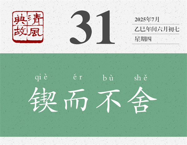 這段(duan)話中,為后人貢獻了(le)好(hao)幾個典故(gu),一(yi)(yi)個是(shi)“跬步千里”,一(yi)(yi)個是(shi)“鍥而(er)(er)(er)(er)不(bu)(bu)舍(she)(she)”。前者從(cong)“不(bu)(bu)積跬步,無以(yi)(yi)至千里”而(er)(er)(er)(er)來,不(bu)(bu)過只(zhi)是(shi)反其意而(er)(er)(er)(er)用之(zhi),意思是(shi),只(zhi)要一(yi)(yi)步一(yi)(yi)步走下去,就能(neng)達到(dao)千里之(zhi)遠。后者是(shi)從(cong)“鍥而(er)(er)(er)(er)不(bu)(bu)舍(she)(she),金石可鏤(lou)”而(er)(er)(er)(er)來,意思非常清楚(chu):一(yi)(yi)直(zhi)雕刻(ke)(ke)而(er)(er)(er)(er)不(bu)(bu)停止,即使一(yi)(yi)塊金石也能(neng)雕刻(ke)(ke)成器。后即以(yi)(yi)“鍥而(er)(er)(er)(er)不(bu)(bu)舍(she)(she)”比喻有(you)恒心,有(you)毅力。章炳麟《菌說》:“夫固謂(wei)一(yi)(yi)人鍥而(er)(er)(er)(er)不(bu)(bu)舍(she)(she),則行(xing)美(mei)于本性矣。”