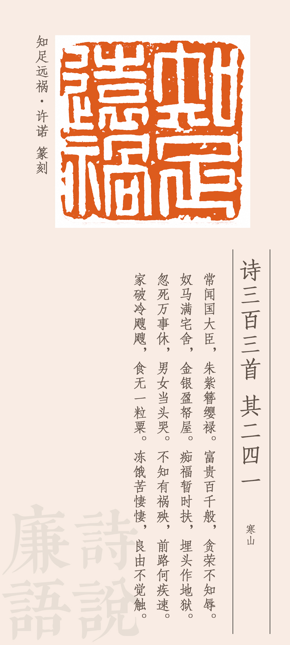 這(zhe)首詩是(shi)諷(feng)刺高官(guan)貪圖富(fu)貴、聚斂財(cai)物的(de)(de)。他(ta)說,有些國之大臣,穿(chuan)戴(dai)尊榮,好不(bu)(bu)威風(feng),享受(shou)千般(ban)榮華富(fu)貴,卻(que)一(yi)點兒都不(bu)(bu)顧及廉(lian)恥榮辱,家中擁有大量駿馬奴仆,屋子里堆滿金銀財(cai)寶,自以為這(zhe)是(shi)在享福,其實是(shi)在給(gei)自己挖墳墓(mu)地獄。一(yi)旦死去,萬(wan)事(shi)皆休,富(fu)貴是(shi)無法永久保留的(de)(de)。如果因(yin)貪腐而(er)遭(zao)受(shou)禍殃,那下(xia)場就會很慘。家破人亡,挨凍受(shou)餓,凄風(feng)苦雨,苦不(bu)(bu)堪言。最(zui)后一(yi)句卒章顯(xian)志:之所(suo)以會有這(zhe)樣的(de)(de)遭(zao)遇和(he)結(jie)局(ju),是(shi)因(yin)為沒(mei)有悟透取(qu)禍的(de)(de)原(yuan)因(yin)。這(zhe)個原(yuan)因(yin)從前面所(suo)述來看,就是(shi)太(tai)貪婪、不(bu)(bu)知足。