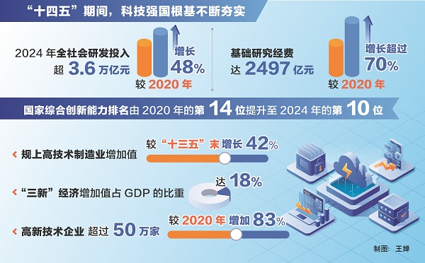 “這(zhe)五年,科(ke)(ke)技創新(xin)能(neng)力(li)穩(wen)步(bu)提(ti)升,科(ke)(ke)技強(qiang)國(guo)根基不斷夯實。”陰和(he)俊(jun)說,我國(guo)科(ke)(ke)技投(tou)入持續增加,2024年全社會研(yan)(yan)發投(tou)入超3.6萬(wan)億元,較2020年增長48%;基礎研(yan)(yan)究經(jing)費達2497億元,較2020年增長超過70%,在(zai)量子科(ke)(ke)技、生(sheng)命科(ke)(ke)學(xue)、物(wu)質科(ke)(ke)學(xue)、空間科(ke)(ke)學(xue)等領(ling)域取得一批重大(da)原創性(xing)成果(guo);國(guo)家實驗室體(ti)系建設穩(wen)步(bu)推進,國(guo)家科(ke)(ke)研(yan)(yan)機(ji)構(gou)、高水平研(yan)(yan)究型(xing)大(da)學(xue)科(ke)(ke)研(yan)(yan)能(neng)力(li)不斷提(ti)升,科(ke)(ke)技領(ling)軍企(qi)業加快培育成長;北京、上海、粵港(gang)澳大(da)灣區國(guo)際科(ke)(ke)創中心支撐引領(ling)和(he)輻射帶動作用不斷增強(qiang),深圳-香港(gang)-廣州躍居全球百強(qiang)創新(xin)集群(qun)榜首(shou);國(guo)家綜(zong)合創新(xin)能(neng)力(li)排(pai)名由2020年的(de)第14位(wei)提(ti)升至2024年的(de)第10位(wei)。