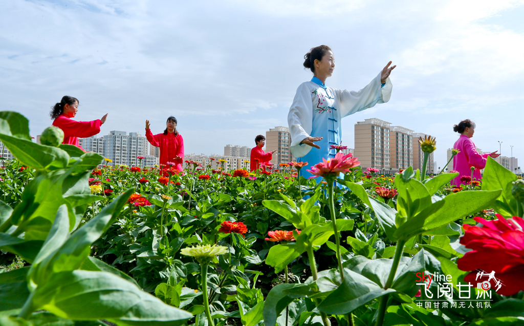 7月8日清(qing)晨,甘(gan)肅張掖甘(gan)州(zhou)區順祥(xiang)名苑(yuan)小(xiao)區南側的(de)123畝裸露土地(di)綠化(hua)美(mei)化(hua)點(dian)上,各種(zhong)鮮花競相綻放,花香(xiang)四(si)溢,綠意盎(ang)然(ran),太極拳練(lian)習(xi)愛好者(zhe)正(zheng)在練(lian)習(xi)太極拳。