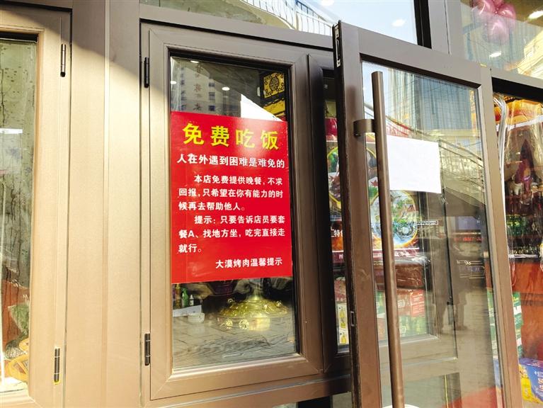 丁占東指的(de)(de)宣傳單(dan)(dan),是小伙子在店(dian)門(men)口看到的(de)(de)一(yi)則(ze)“溫(wen)馨提示”,上面寫著:人(ren)在外遇到困(kun)難是難免(mian)的(de)(de),本店(dian)免(mian)費提供(gong)晚(wan)餐,不求回報(bao),只(zhi)希望在你有能力的(de)(de)時候再去幫助他人(ren)。這張宣傳單(dan)(dan)的(de)(de)內容還包含另(ling)一(yi)則(ze)提示:只(zhi)要告訴(su)店(dian)員要套餐A、找地方坐(zuo),吃(chi)完(wan)直接走就行。