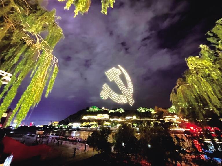 今夜的(de)蘭州經過雨水的(de)沖洗格外清(qing)爽嫵媚,在現(xian)場,600架無人(ren)機翱翔天空,照亮璀璨的(de)蘭州之(zhi)夜,無人(ren)機在遙控(kong)下變換著(zhu)各種隊形(xing)和字樣,表達對(dui)黨的(de)生日祝福。