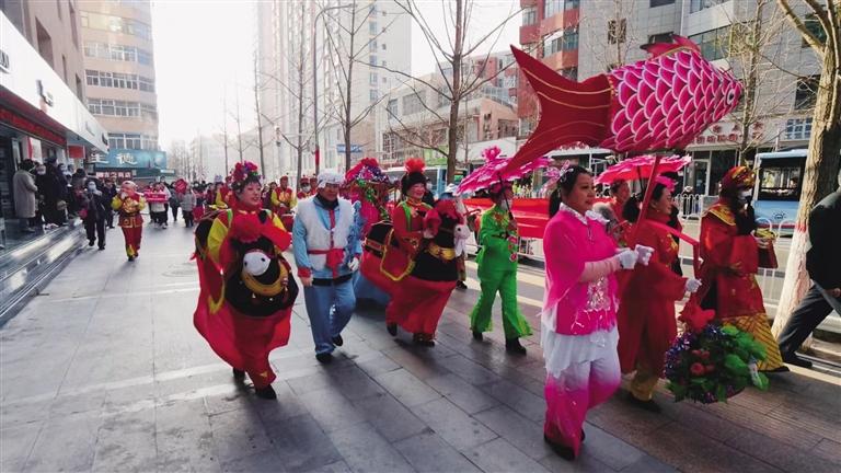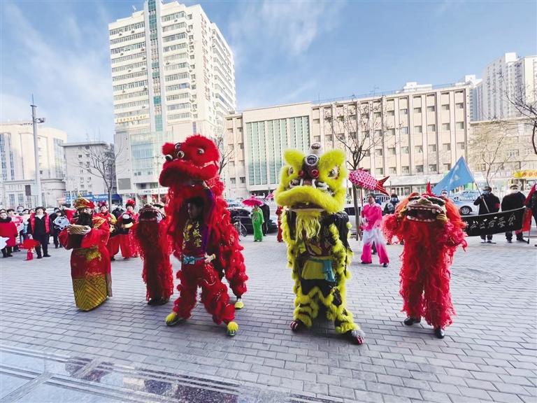 社區工作人員、舞獅隊、社火(huo)隊和(he)大鼓隊為轄區居民帶來了扭秧歌(ge)、舞獅、敲大鼓、大頭娃娃和(he)劃旱船等(deng)表(biao)演。