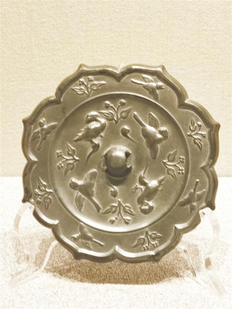 平涼市(shi)博物(wu)館藏(zang),唐代(dai),八瓣菱花形,內切圓形,圓鈕。上下左右交隔(ge)對(dui)稱分(fen)布四(si)只鸞鳥、四(si)枝二葉二苞折枝花。