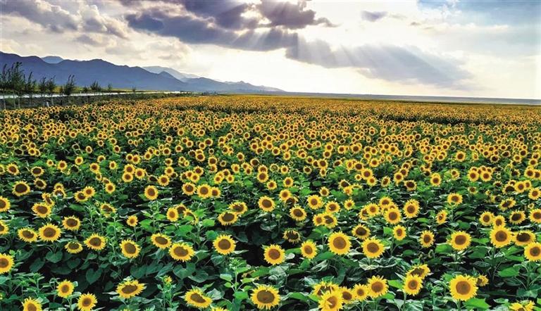 時下,位于白銀市(shi)景泰縣寺(si)灘(tan)鄉境內的(de)永泰川(chuan)戈(ge)壁灘(tan),萬(wan)畝(mu)滴灌的(de)旱(han)砂田里(li)葵花盛開,斜陽之下猶(you)如(ru)一幅金(jin)色畫卷。