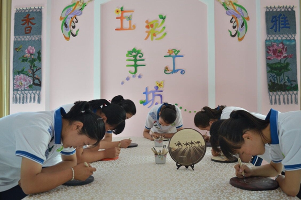 敦(dun)煌(huang)市黃渠中(zhong)學(xue)(xue)學(xue)(xue)生學(xue)(xue)習木板雕刻(ke)畫。敦(dun)煌(huang)市委宣傳部供(gong)圖