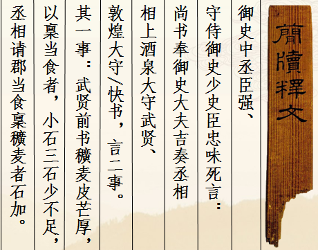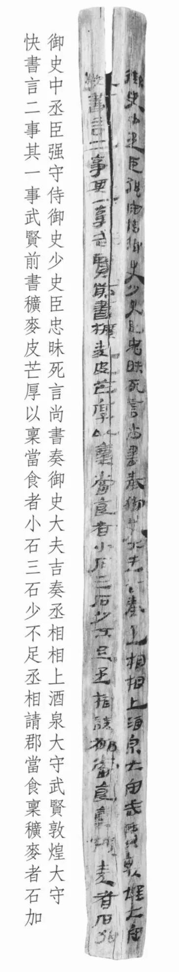 此簡為(wei)漢宣帝(di)(di)回復酒泉太(tai)(tai)守“辛武賢”和敦煌太(tai)(tai)守“快(kuai)”奏疏(shu)的(de)(de)恩準詔書,簡文(wen)(wen)記載(zai)的(de)(de)是皇(huang)帝(di)(di)詔書中(zhong)對兩太(tai)(tai)守奏疏(shu)內容(rong)(rong)的(de)(de)復述。從簡文(wen)(wen)內容(rong)(rong)看,酒泉太(tai)(tai)守辛武賢和敦煌太(tai)(tai)守快(kuai)給(gei)朝廷的(de)(de)奏疏(shu)主要涉及兩件事(shi)情:一是辛武賢認(ren)為(wei)作(zuo)為(wei)糧草的(de)(de)穬(gong)麥因皮厚芒長,如(ru)按規定(ding)每人發放小石三石,會(hui)造成實際(ji)數(shu)量的(de)(de)不(bu)足,所以他請(qing)求皇(huang)帝(di)(di)每石加發若干。另一件事(shi)顯然是敦煌太(tai)(tai)守快(kuai)的(de)(de)上(shang)書,但文(wen)(wen)字未能容(rong)(rong)納于此簡,故不(bu)得而知。