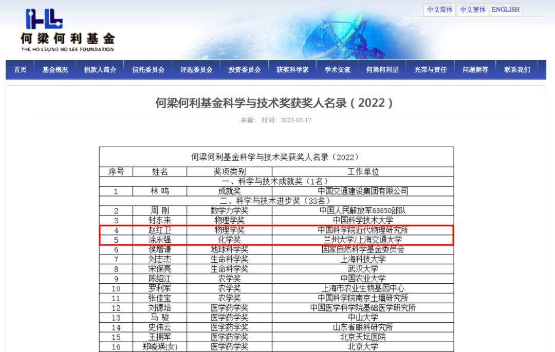 日前(qian),何(he)梁何(he)利基金2021和2022年度(du)(du)頒獎(jiang)大(da)會在北京舉(ju)行,共(gong)授予112名杰出科技(ji)工作者。其中,中國科學(xue)院近代物理研(yan)究所趙(zhao)紅衛、蘭州大(da)學(xue)涂永(yong)強榮獲(huo)2022年度(du)(du)何(he)梁何(he)利基金科學(xue)與技(ji)術進步獎(jiang)。