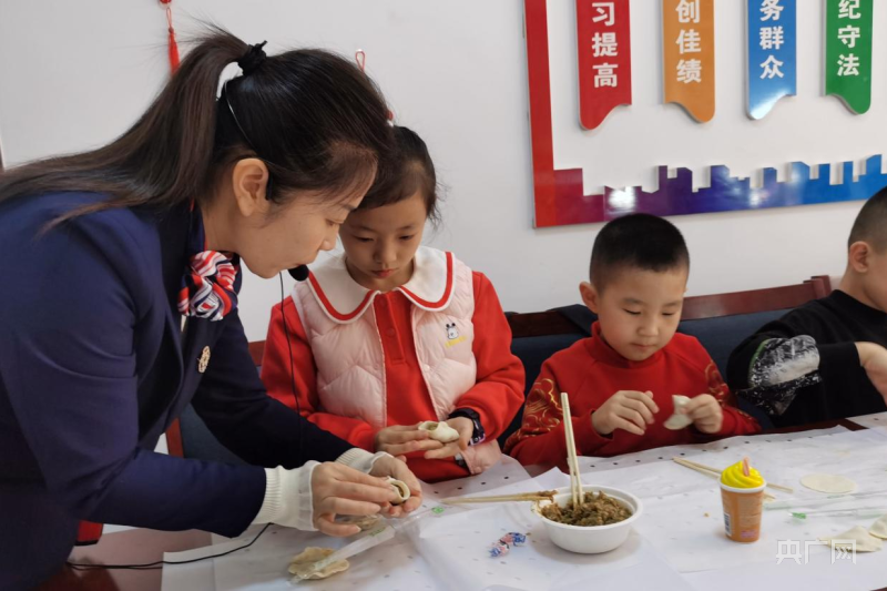 孩子(zi)們聽(ting)老師(shi)講傳統習俗體驗包(bao)餃子(zi)(央廣(guang)網發(fa) 唐欣 攝(she))