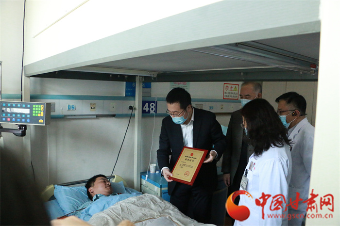 甘(gan)肅(su)省(sheng)紅十字會黨組書(shu)記、專職副會長(chang)楊芳勝為(wei)甘(gan)肅(su)省(sheng)第54例造血干細胞捐(juan)獻(xian)者龔(gong)先生頒發“博(bo)愛金獎”和榮譽證書(shu)
