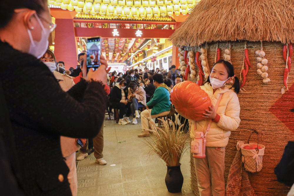 ↑3月25日,小(xiao)游客在“黃河食(shi)渡文化夜市”拍照(zhao)留念。