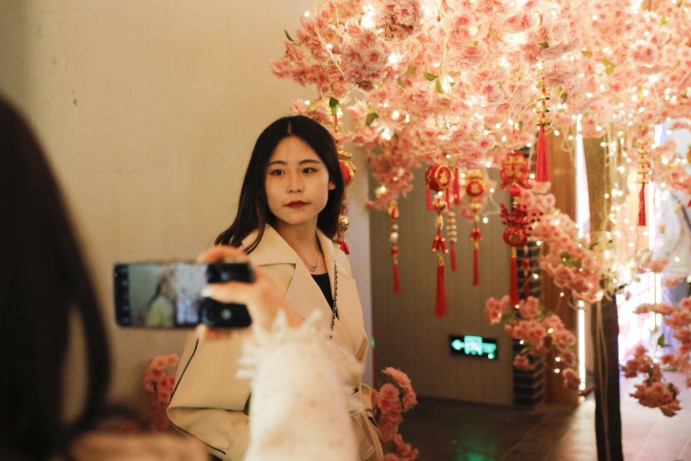 ↑3月25日(ri),游客在“黃河食渡文化夜(ye)市”拍照留(liu)念。