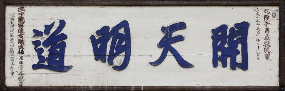 該(gai)匾(bian)懸(xuan)于天(tian)水伏羲(xi)廟大門前牌坊正中(zhong)。長(chang)3.5米(mi),寬1.25米(mi),厚0.12米(mi)。素邊,匾(bian)心白底藍(lan)字,上(shang)下款(kuan)(kuan)(kuan)朱書。此(ci)匾(bian)有雙上(shang)款(kuan)(kuan)(kuan)和雙下款(kuan)(kuan)(kuan)。第一個上(shang)款(kuan)(kuan)(kuan)為(wei)(wei)(wei)“乾隆辛酉孟秋既(ji)望”,下款(kuan)(kuan)(kuan)為(wei)(wei)(wei)“湟(huang)中(zhong)觀察使者遼海楊(yang)應琚薰沐敬書”;第二個上(shang)款(kuan)(kuan)(kuan)為(wei)(wei)(wei)“嘉慶(qing)十(shi)二年歲次丁卯五月吉(ji)旦”,下款(kuan)(kuan)(kuan)為(wei)(wei)(wei)“中(zhong)憲大夫寧夏府(fu)(fu)知府(fu)(fu)候補知秦州(zhou)事王公(gong)重建”。