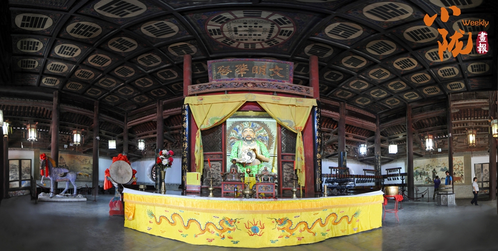 先天殿(dian)莊嚴肅穆,殿(dian)內正中便是高達3米的人文(wen)(wen)始祖伏羲坐身塑(su)像,樹(shu)葉披身,手持八卦(gua)盤,氣(qi)宇軒昂,雙目炯(jiong)炯(jiong)凝視前方(fang),神龕上(shang)方(fang)懸掛(gua)著清嘉慶時州牧王(wang)賜均書“文(wen)(wen)明肇啟”巨匾,仰頭上(shang)望,頂上(shang)繪有(you)河圖(tu)洛(luo)書、六十四卦(gua),令人肅然(ran)起敬。