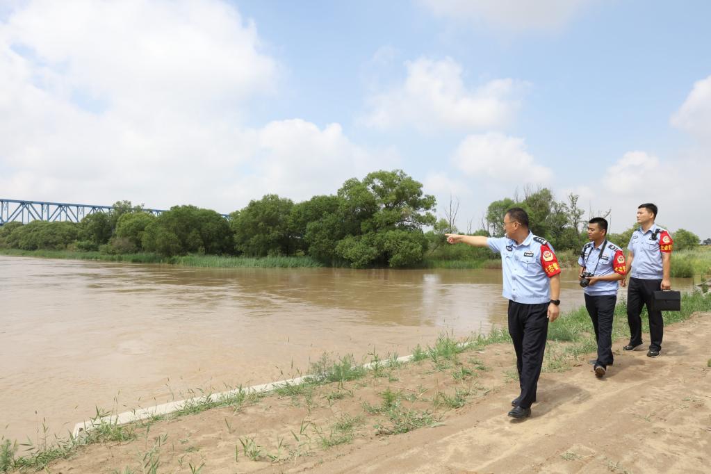黃河派出所和黃河河務(wu)局水政監(jian)察大(da)隊人(ren)員對刁口河生態補水進(jin)行巡(xun)查。新華社記者(zhe) 劉(liu)詩平 攝(she)