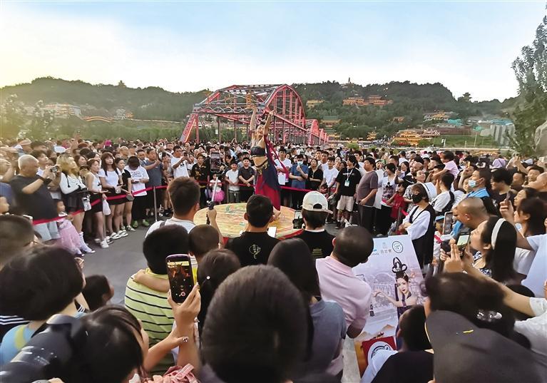 圖(tu)為中山橋(qiao)前的敦煌舞表演引(yin)游客圍觀。