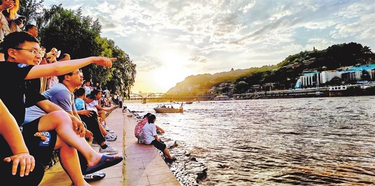 旅(lv)游旺季,游客在黃河邊納涼游玩。
