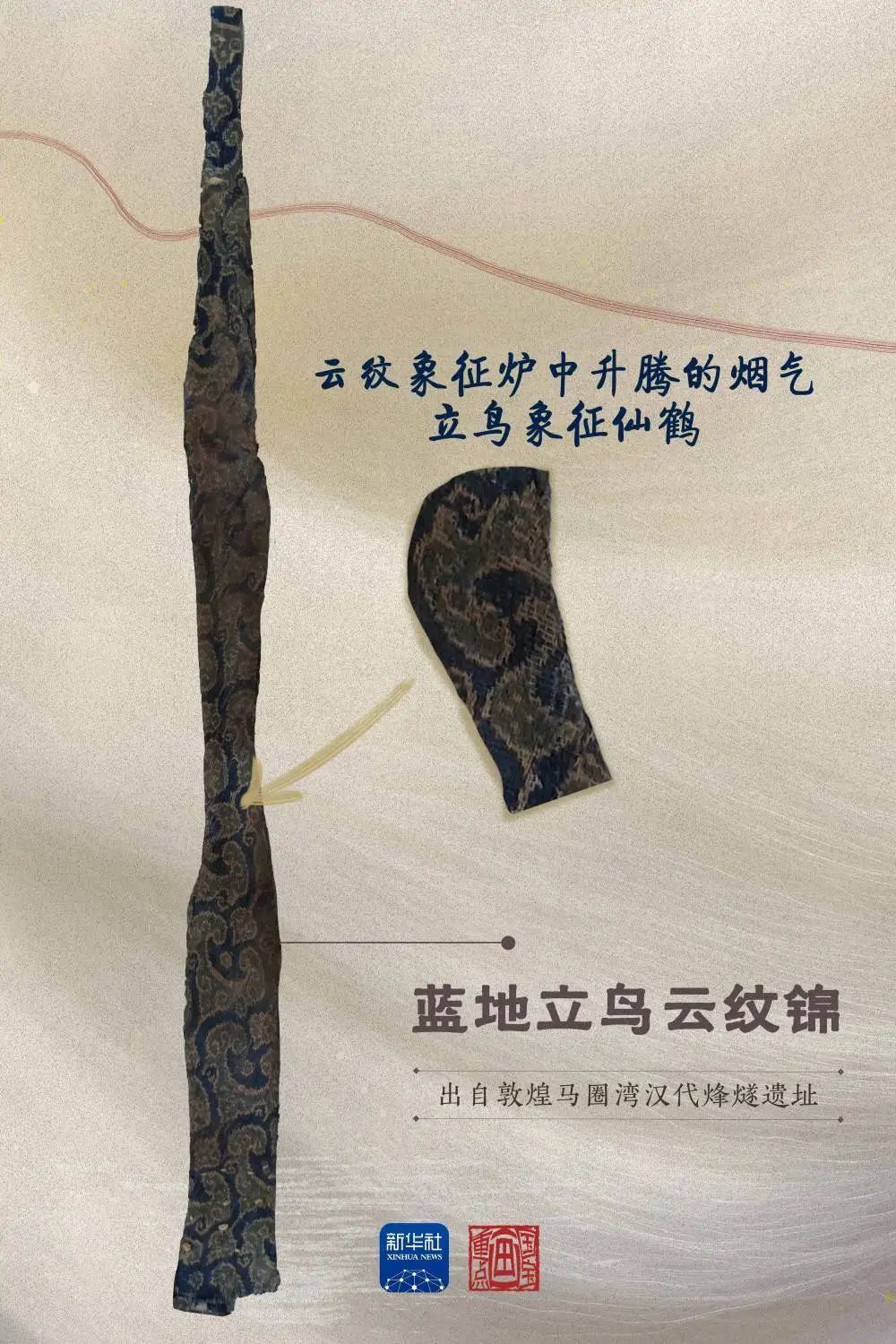 這件(jian)織錦(jin)(jin)殘(can)件(jian)采(cai)用漢代(dai)典型的絲織技藝——平紋經錦(jin)(jin),此錦(jin)(jin)以深(shen)藍為(wei)地,顯黃(huang)、綠二色花,織出(chu)云氣紋。專家推(tui)測該(gai)織錦(jin)(jin)曾(ceng)為(wei)裝飾用物。
