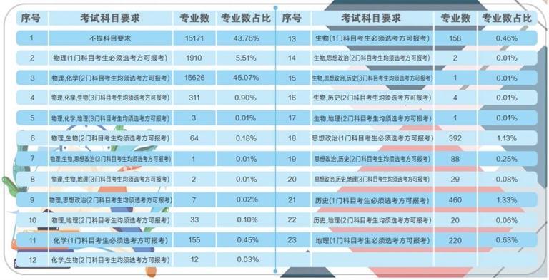 據了解,根據《甘肅(su)省深化高(gao)等學(xue)校(xiao)考(kao)(kao)試(shi)(shi)(shi)招(zhao)生綜(zong)合改革實(shi)施方(fang)案》要(yao)求,從(cong) 2021年(nian)(nian)秋(qiu)季入學(xue)的(de)(de)(de)(de)普通高(gao)中(zhong)一年(nian)(nian)級學(xue)生開始,實(shi)行基于統一高(gao)考(kao)(kao)和高(gao)中(zhong)學(xue)業水平考(kao)(kao)試(shi)(shi)(shi)成績、參考(kao)(kao)綜(zong)合素質評價的(de)(de)(de)(de)高(gao)校(xiao)考(kao)(kao)試(shi)(shi)(shi)招(zhao)生模式。到2024年(nian)(nian),基本(ben)形(xing)成分類(lei)考(kao)(kao)試(shi)(shi)(shi)、綜(zong)合評價、多元錄取(qu)的(de)(de)(de)(de)高(gao)校(xiao)考(kao)(kao)試(shi)(shi)(shi)招(zhao)生制度,健全促(cu)進公平、科學(xue)選才、監督有(you)力(li)的(de)(de)(de)(de)高(gao)校(xiao)考(kao)(kao)試(shi)(shi)(shi)招(zhao)生體(ti)制機制。此次(ci)在我省報(bao)送(song)選考(kao)(kao)科目(mu)(mu)要(yao)求的(de)(de)(de)(de)高(gao)校(xiao)專(zhuan)業共計64092條(tiao)(tiao),其(qi)(qi)中(zhong)本(ben)科專(zhuan)業34670條(tiao)(tiao)。專(zhuan)業選考(kao)(kao)科目(mu)(mu)要(yao)求共有(you)23種(zhong)組(zu)合,其(qi)(qi)中(zhong)不提科目(mu)(mu)要(yao)求的(de)(de)(de)(de)本(ben)科專(zhuan)業數(shu)量(liang)占(zhan)本(ben)科專(zhuan)業總數(shu)的(de)(de)(de)(de)43.76%,含(han)物理科目(mu)(mu)的(de)(de)(de)(de)占(zhan)比為51.79%,含(han)化學(xue)科目(mu)(mu)的(de)(de)(de)(de)占(zhan)比為46.46%,含(han)歷史科目(mu)(mu)的(de)(de)(de)(de)占(zhan)比為1.74%,含(han)“物理+化學(xue)”科目(mu)(mu)的(de)(de)(de)(de)占(zhan)比為45.98%。