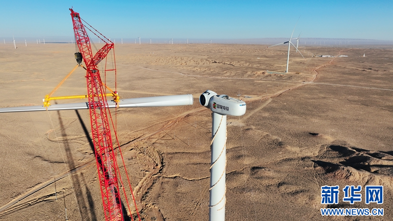 隆冬季節,在甘肅省張掖市甘州區平(ping)山湖(hu)風電(dian)基地國家電(dian)投10萬千(qian)瓦風電(dian)項目建(jian)設工地,工人正在進行風機葉片吊裝作(zuo)業。
