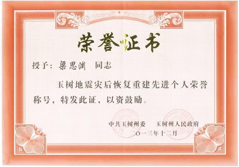 他一直這樣嚴(yan)于要求自己。因在(zai)格(ge)薩爾王賓(bin)館地震遺址維修(xiu)保(bao)護項目中作出突出貢獻,梁思淵被(bei)玉(yu)樹(shu)州委、州政府(fu)評為“玉(yu)樹(shu)地震災后恢復(fu)重(zhong)建(jian)先進個人”。疫(yi)情(qing)期(qi)間,他主(zhu)動請纓(ying),參與雁南路街道防(fang)疫(yi)物(wu)資運輸保(bao)障任務,轉運物(wu)資總計150多趟(tang)次。