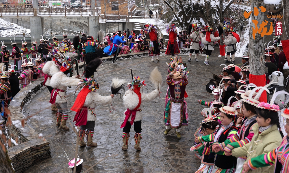 河(he)畔的小路上和河(he)岸(an)的觀景臺(tai)上,白馬人身著特色(se)服飾,錯(cuo)落有致,載(zai)歌載(zai)舞,跳起(qi)了獨具(ju)魅(mei)力的“池哥晝”。
