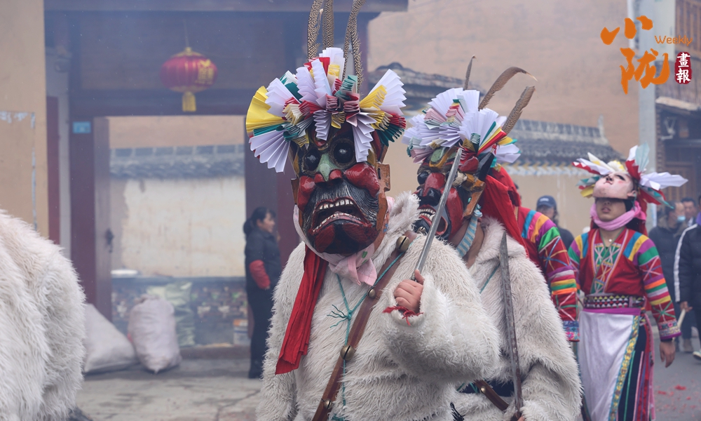 表演的(de)隊伍圍著(zhu)寨子挨(ai)家(jia)挨(ai)戶去跳,舞(wu)者至(zhi)少三人,三人以上不限,皆頭戴面具,在“咚咚咚”的(de)鼓聲和“哐哐哐”的(de)鑼聲伴奏下激烈地(di)跳躍,最(zui)后(hou)跳到田(tian)邊地(di)角(jiao)為(wei)止。