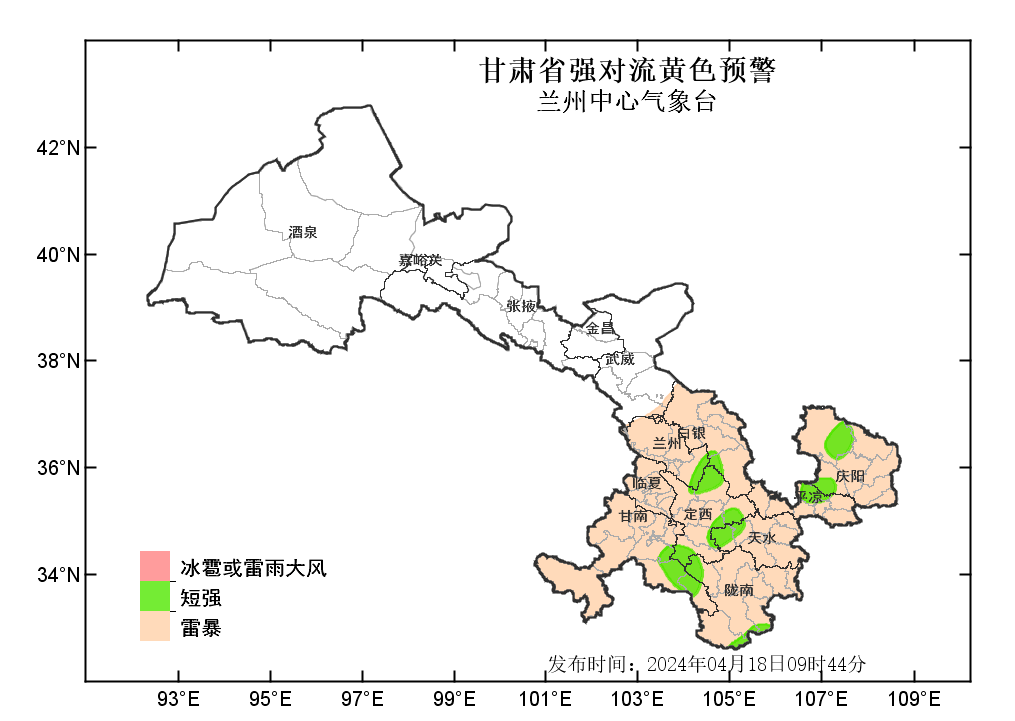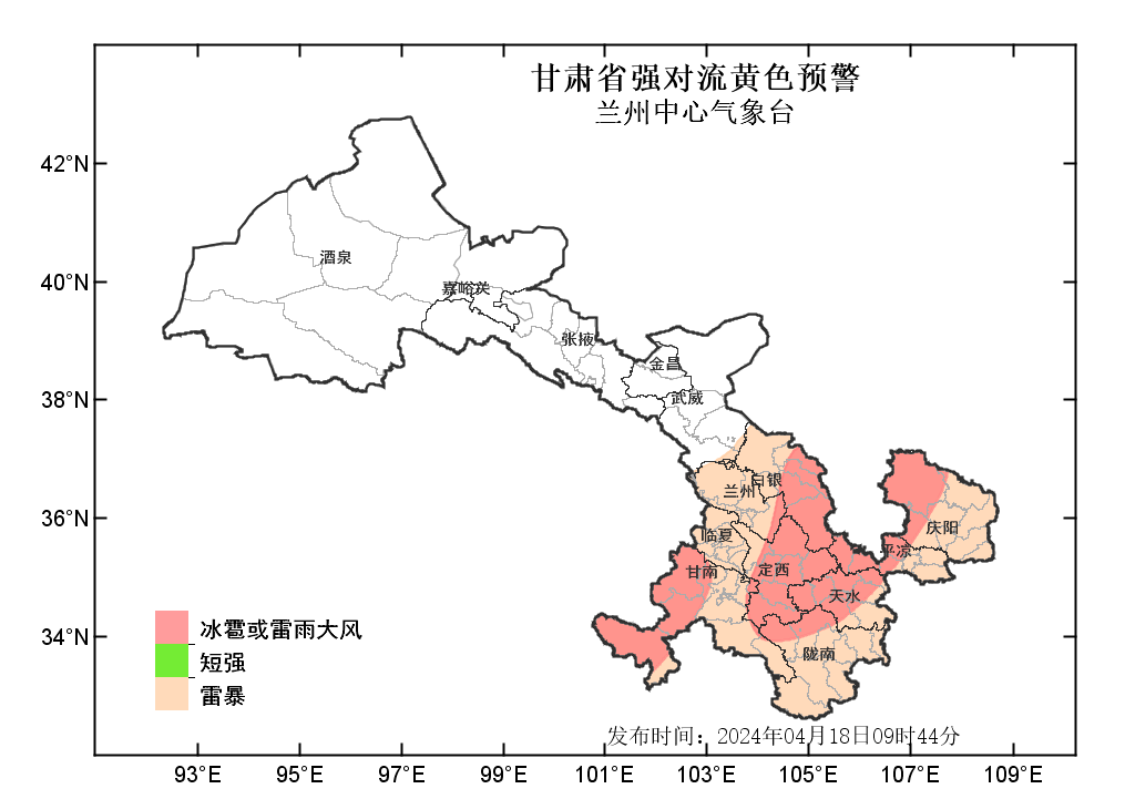 中國甘肅網(wang)4月(yue)18日訊(西北(bei)角·中國甘肅網記者 沈(shen)文剛)4月(yue)18日9時44分(fen),蘭(lan)州(zhou)中心氣(qi)象臺發布(bu)強(qiang)(qiang)對流黃色預(yu)(yu)警:預(yu)(yu)計今天(tian)白天(tian)到(dao)夜間,武(wu)威以(yi)東大(da)部(bu)(bu)分(fen)地方(fang)有雷暴;其中,白銀、定西、甘南、天(tian)水等市州(zhou)部(bu)(bu)分(fen)地方(fang)及蘭(lan)州(zhou)、隴(long)南、平(ping)涼、慶陽等市局部(bu)(bu)地方(fang)有雷雨(yu)大(da)風或冰雹;甘南、隴(long)南、定西、天(tian)水、白銀、蘭(lan)州(zhou)、平(ping)涼、慶陽等州(zhou)市局部(bu)(bu)地方(fang)有短時強(qiang)(qiang)降(jiang)水,最大(da)小時雨(yu)強(qiang)(qiang)為20-30毫米。