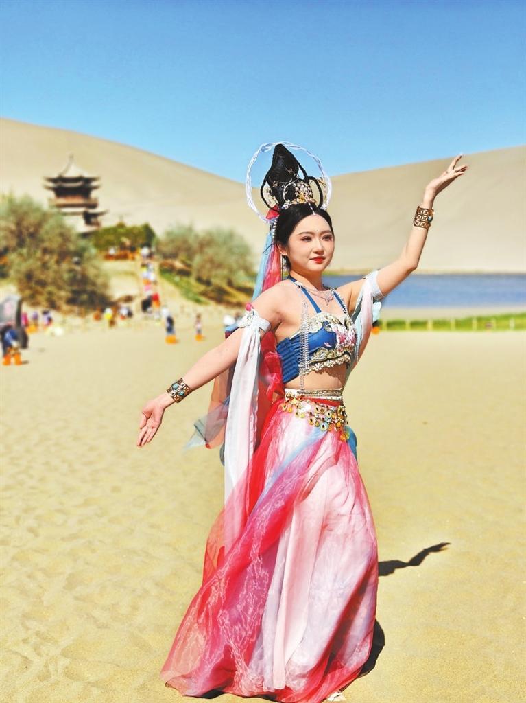 游客在(zai)月牙(ya)泉景區身(shen)著“飛天”服(fu)飾拍(pai)照。