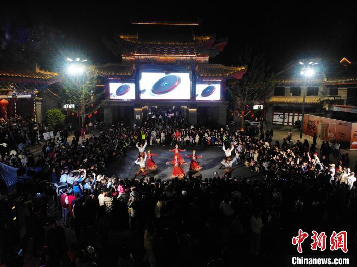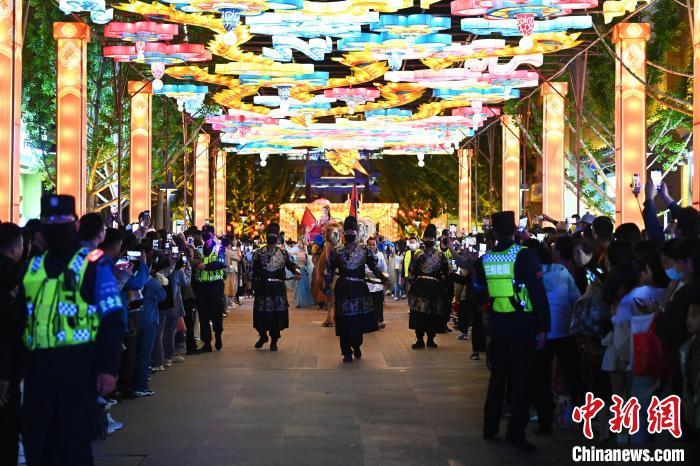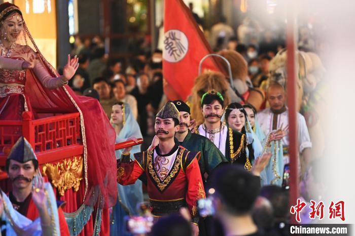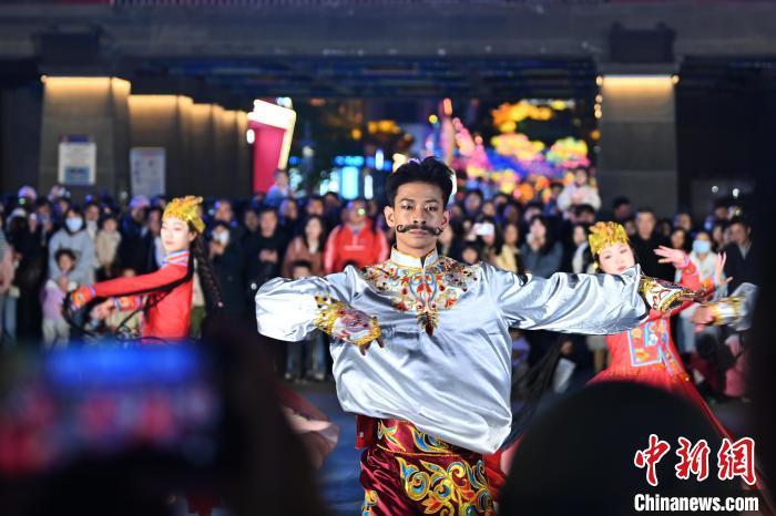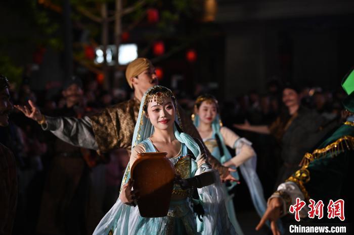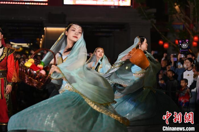 5月3日晚,甘肅(su)省蘭(lan)州市七里河(he)區蘭(lan)州老街上演的大型情景巡游《樓蘭(lan)之(zhi)旅》吸引游客。李亞龍 攝