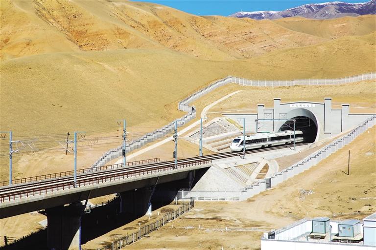 列(lie)車穿(chuan)越蘭張高鐵(tie)蘭武(wu)段新烏(wu)鞘嶺隧道