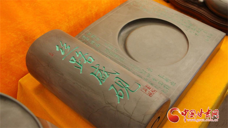 嘉峪石硯,取材于嘉峪山后的黑山峽深處,故又稱“黑山石硯”,是目前所知最早的古石硯之一。這種石硯質堅而細、扣之有聲,發墨快而不損毫,儲墨久而不干,“有史記載的三百多種石硯中,只有嘉峪石硯是帶有銘文出土的。這對于石硯的研究具有重要的史料價值。”劉宗學向實踐團成員系統地講述了嘉峪石硯的傳承歷史,并展示了自己以絲綢之路為主題創作的“絲路盛硯”組合石硯。這套石硯主要以甘肅十四個地州市的建筑、景觀、歷史人物為內容,體現了甘肅省的根脈文化、黃河文化、長城文化、絲路文化、紅色文化等五大文化,表現出甘肅在絲綢之路經濟發展與文化交流中的重要作用。