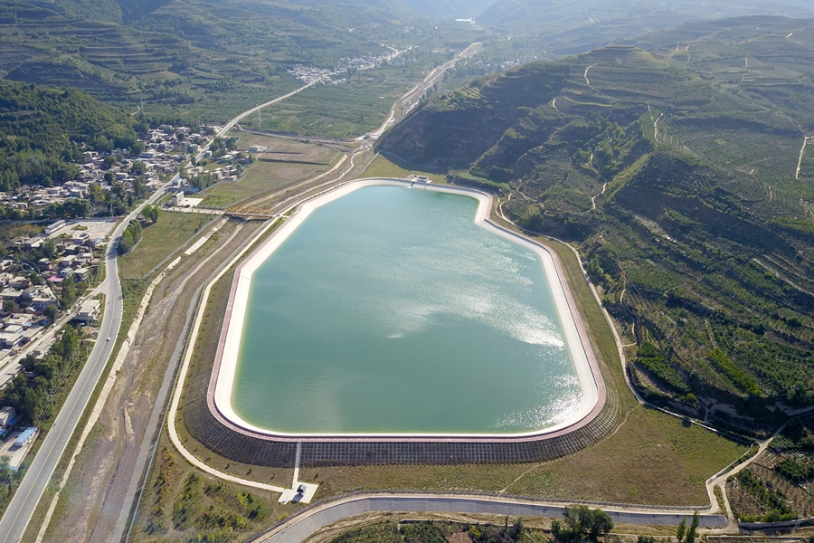 這是在天水市拍攝的已投用的天水城區引洮供(gong)水工程楊家灣(wan)調(diao)蓄(xu)水池(無人機照片)。新(xin)華(hua)社記者范(fan)培(pei)珅(shen)攝