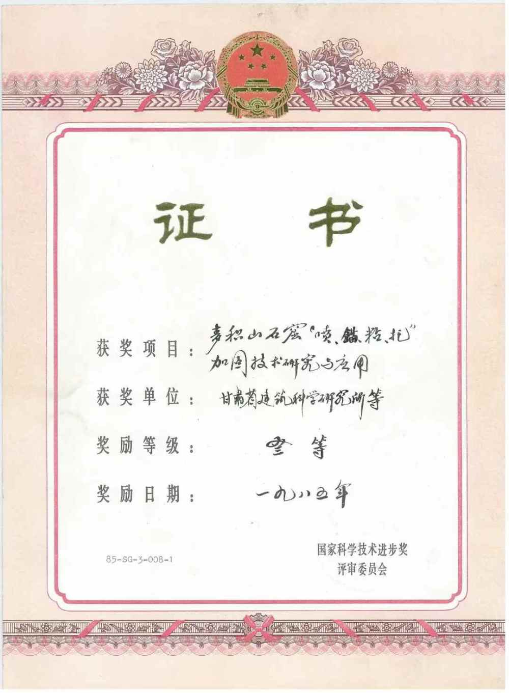 鑒定認為,麥積(ji)山石窟維修加固(gu)工程(cheng)在總結(jie)了(le)(le)(le)國內巖(yan)體(ti)加固(gu)經(jing)驗的(de)(de)基礎上,結(jie)合麥積(ji)山石窟巖(yan)體(ti)的(de)(de)特點和不改變原(yuan)狀的(de)(de)原(yuan)則(ze),成功地采用了(le)(le)(le)“噴、錨、粘、托”綜合加固(gu)技(ji)術,為保護石窟文物開(kai)創了(le)(le)(le)一條新的(de)(de)途徑。1985年,甘(gan)肅建科(ke)院榮獲國家(jia)科(ke)技(ji)進步獎(jiang)三(san)等獎(jiang)、甘(gan)肅科(ke)技(ji)成果(guo)獎(jiang)二(er)等獎(jiang)。