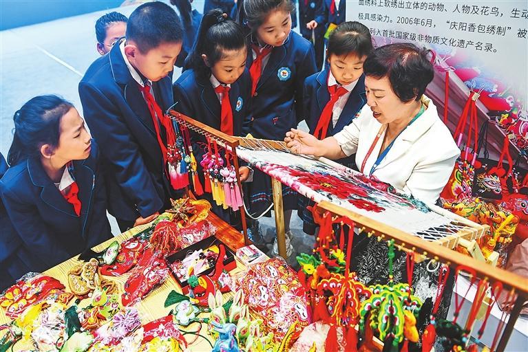 9月22日,慶陽香包刺(ci)繡展位非遺(yi)傳(chuan)承(cheng)人給孩子們展示刺(ci)繡技(ji)藝。新(xin)甘(gan)肅·甘(gan)肅日報記者(zhe)丁凱
